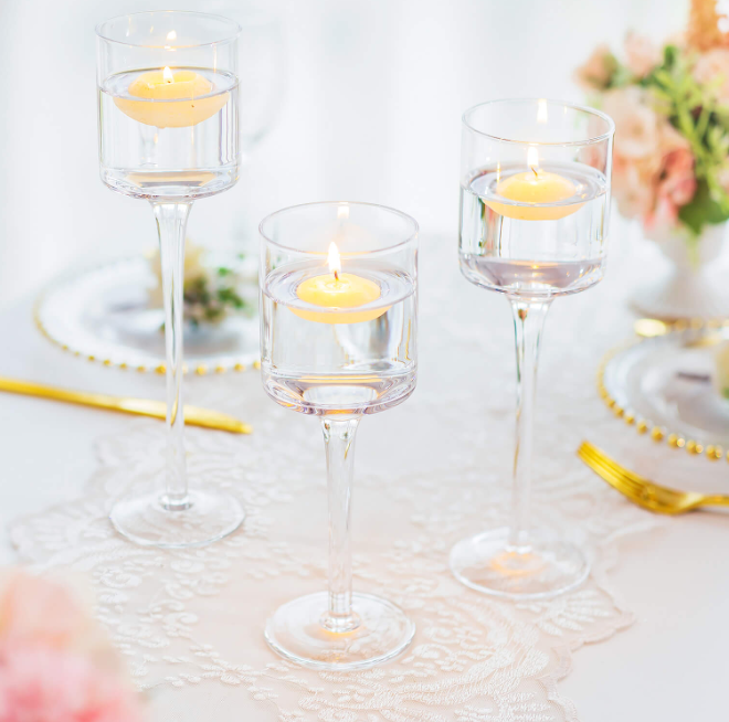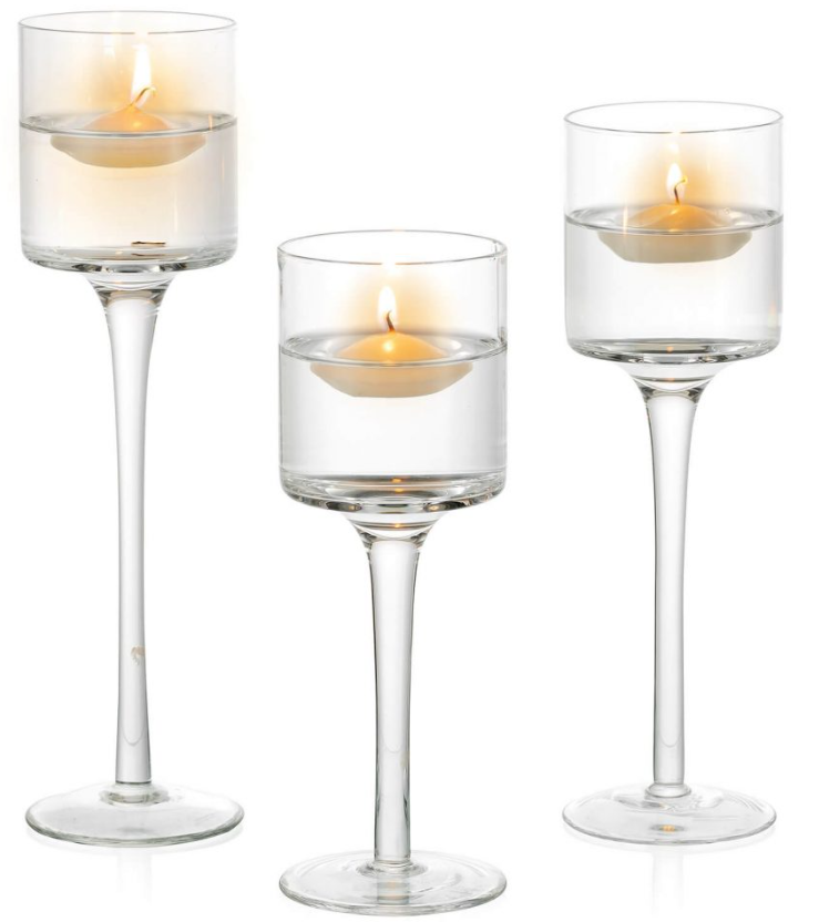Elegant stem tealight holders varying size set of 3 for hire. Size Large: hight 26cm, Medium : hight 23cm, Small: hight 20cm. Each tealight diameter: 6cm.